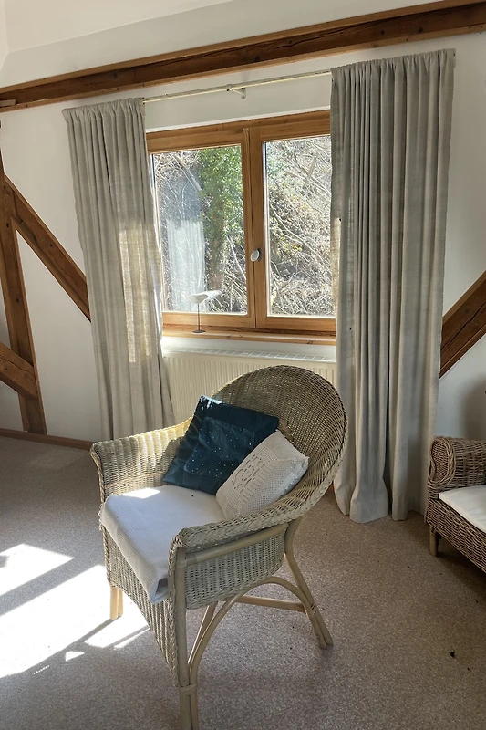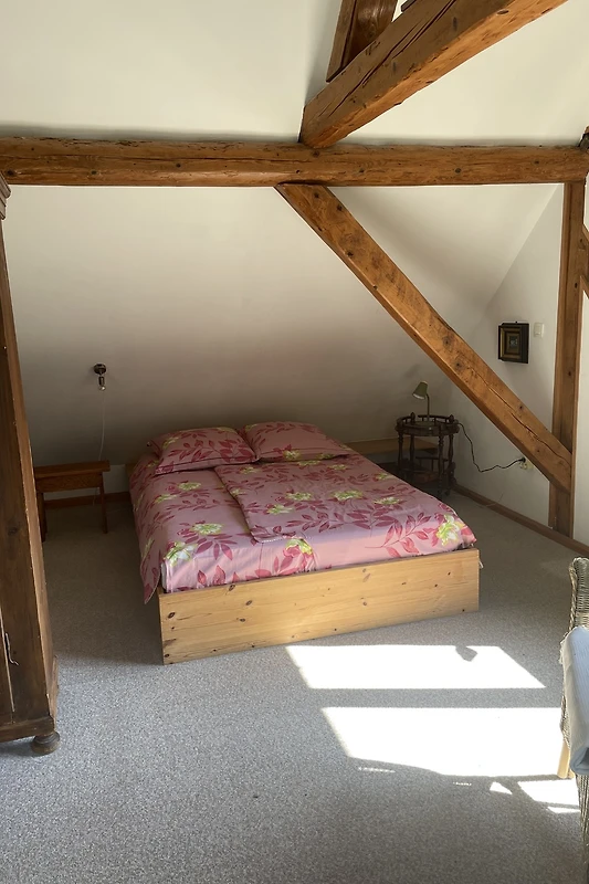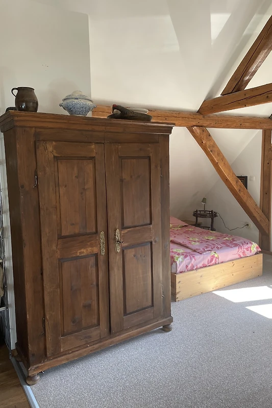 U potkrovlju je pretvoren u prostrani studio apartman s dovoljno prostora za do četiri odrasle osobe 2004. godine. Ispred ulaznih nalazi se na jugozapadu, sunčano, prostranom drvenom terasom sa električnim roštiljem i garniturom za sjedenje. Unutar obnovljena krovnih greda krasi 80 m² veliku, visoku sobu, centar koji je cigla kuhinja i veliki stol sa klupom i stolicama oblika. Možete očekivati svijetle, vrlo ukusno uređena s kombinacijom modernog i antikvar ambijentu. Stražnji prostor za spavanje nije vidljiva iz glavne sobe. Ovdje je 140 cm širok ležaj. Na raspolaganju su i: dječji krevetić + putni krevetić i 100 / 190cm pomoćni ležaj. Na drugoj strani potkrovlja Zastakljen zabat pruža dobar pogled na različite Scenic raspoloženja doline i neba. U ovoj sobi se nalazi televizor i kauč koji se izvukao ima 160 cm širok površine krevet. Ovaj prostor može biti zatvoren preklop vrata. Kuća ima dva odvojena apartmana svaki sa svojom terasom i vlastitim ulazom. Na terasi, pored kuće nalazi se ugljen roštilj koji gosti krovnih studija ili stanu ispod - koristiti - nakon konzultacija s drugima. Vaš bicikli mogu biti smješteni u zasvođen podrum i vaš automobil može biti parkiran protiv struje.