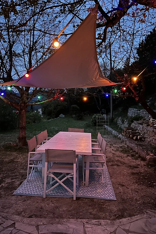 Velika terasa, na kojoj se možete opustiti na udobnom ležaju ili uživati u obroku za najvećim od tri blagovaonska prostora oko imanja, gleda na brežuljkasti krajolik prema jugu. Na istočnoj strani imanja, potpuno skriven, nalazi se bazen sa ležaljkama i suncobranima. Oko imanja nalazi se nekoliko prostora za sjedenje, neki u hladu, a neki više pogodni za one koji vole sunce.
