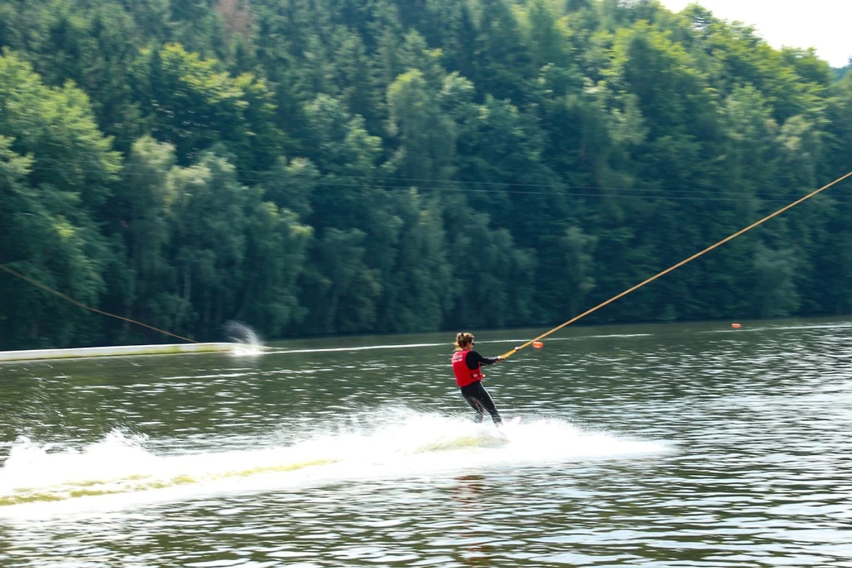 Staza za skijanje na vodi ima orbitu od 700 m. Istovremeno se po vodi može vući do 16 trkača. Brzina je beskonačno promjenjiva od 20 - 64 km/h i stoga se može prilagoditi početnicima ili stručnjacima. Profesionalci se mogu okušati u slalomu ili na skakaonici.