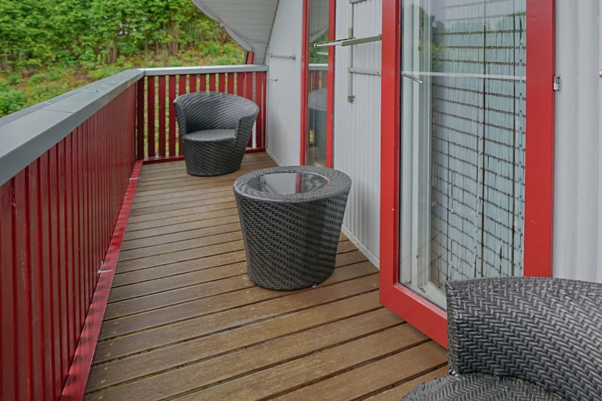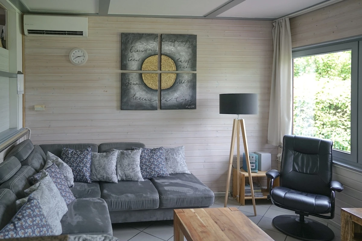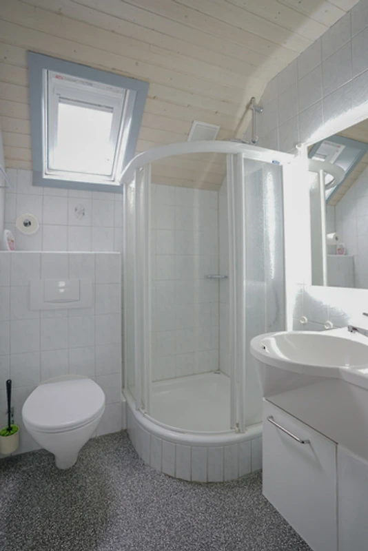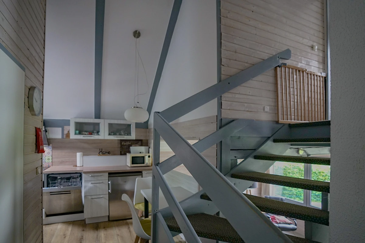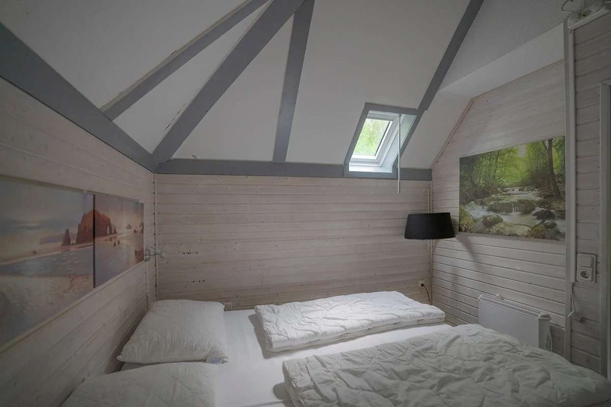 Na katu su još 2 spavaće sobe, jedna s bračnim krevetom, druga s 2 odvojena kreveta. Osim toga, veliki balkon poziva vas da se opustite na gornjem katu i prekrasna terasa ispod u prizemlju. Obje spavaće sobe na gornjem katu imaju svaka svoj balkon (jug). Odavde možete pustiti pogled da luta cijelim turističkim parkom.