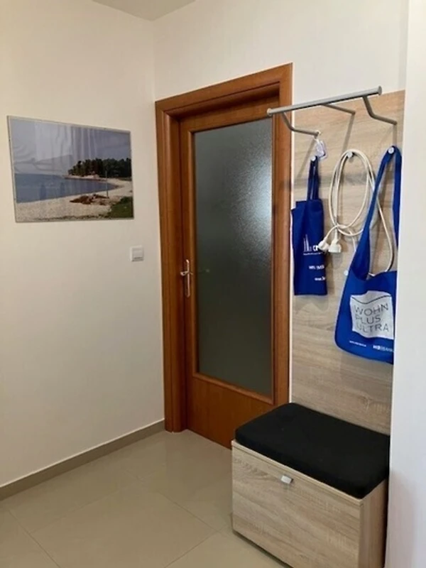 Vrlo lijep apartman za 2-5 osoba (55 m2) na prvom katu kuće s 3 apartmana, na pješačkoj udaljenosti od mora (10 minuta; do mora se može doći i autom; pristupi moru su preko šljunčane plaže i asfaltiranih molova (s ulazom u vodu)). Dvije spavaće sobe, 1 kupaonica (WC, tuš, umivaonik). Za 5. osobu se kauč u dnevnoj kuhinji može pretvoriti u krevet. Balkon i mali vrt s mogućnošću roštiljanja i vrtnim namještajem su na raspolaganju. Kuhinja je potpuno opremljena: ploča za kuhanje, pećnica, mikrovalna pećnica, hladnjak, perilica posuđa, aparat za kavu, kuhalo za vodu. Dostupan je pristup internetu i klima-uređaj. Ručnici, stolnjak i posteljina su osigurani, u kupaonici se nalazi perilica rublja. Prozori imaju zaštitne mreže protiv insekata. U podrumu se nalazi još jedna iskoristiva prostorija (seoska soba). Parkirno mjesto je odmah uz kuću i osigurano rampom. Po potrebi se mogu iznajmiti bicikli.