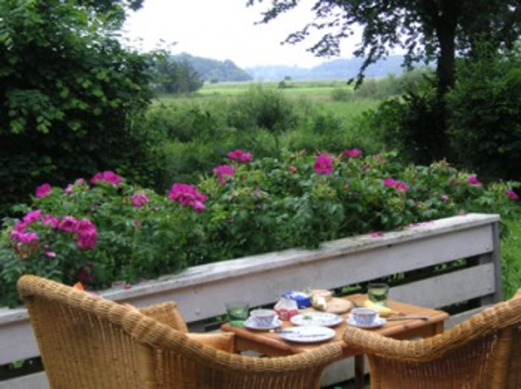 Slamnata kuća okružena je prirodnim vrtom s prekrasnim starim drvećem. S terase se pruža pogled na prirodni rezervat.