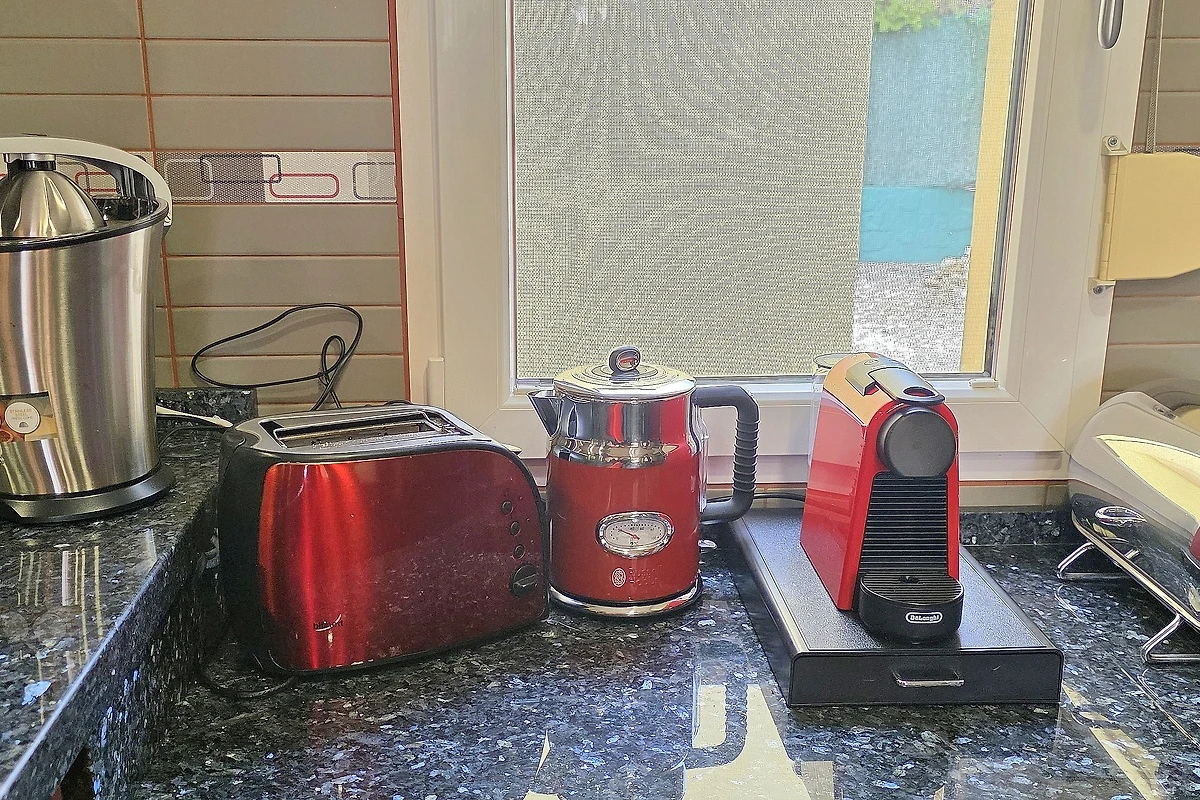 rezač kruha, toster, kuhalo za vodu, 2 x sudoper, posuđe, lonci, tave itd. )